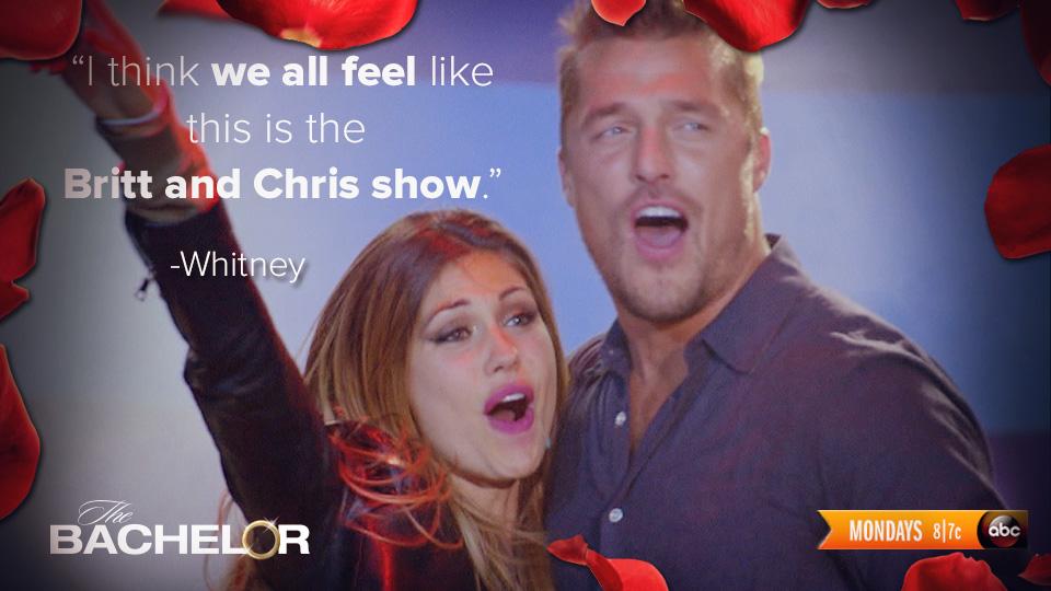 Diplomatic Whitney confides, tear-struck, “I do feel threatened by Britt. I think we all feel like this is the Britt and Chris show… It is hard because you compare yourself to someone who is so beautiful, she’s gorgeous, it makes you feel really insecure about yourself.”