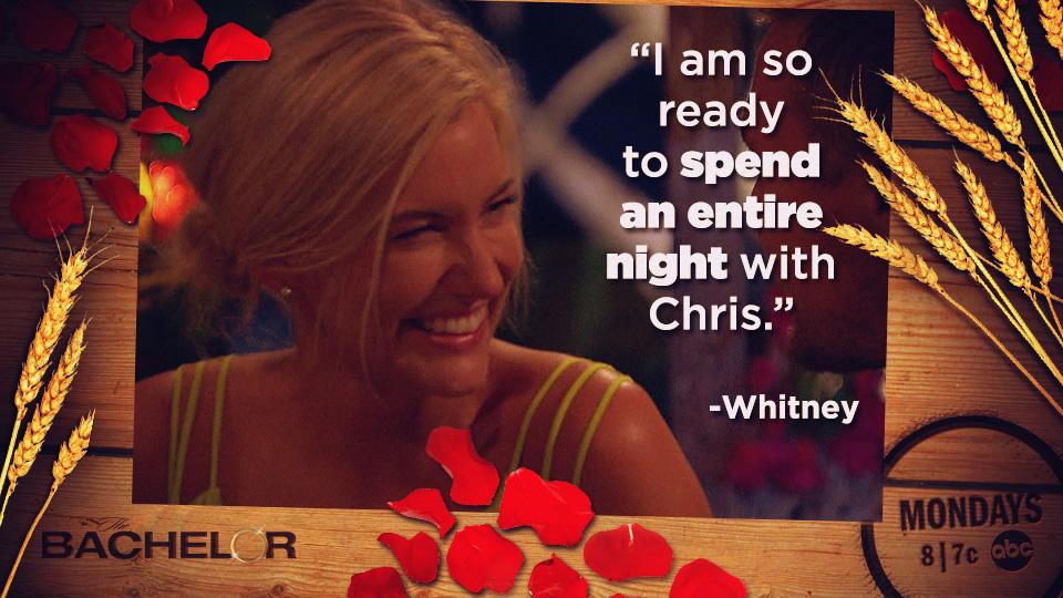 The last moment worth mentioning was Chris and Whitney’s conversation about her potentially moving to Iowa if they were to get married. For a refresher, Whitney is the fertility nurse from Chicago with a very high-pitched but endearing baby voice and a hell of a lot of class. I’m a Whitney fan. Chris addresses his concerns that her career is amazing and it would be a major sacrifice on her part to give it up to move to Arlington. I’ve seen Whitney get some second wave feminist shit for how she treated his question, but this conversation was rad for a lot of reasons.