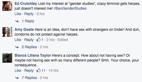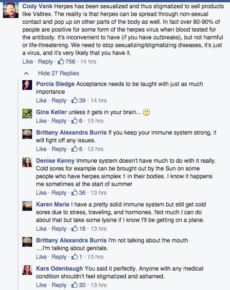 I actually love Facebook comments. A big part of my job in social media is reading feedback on articles and talks in comment threads, and they can be insightful and even heartwarming. Whenever a publication shares a post by or about me on their Facebook page, I make sure to jump into the comments and introduce myself so that interested readers can find my official page more easily. Yes, sexist trolls and conservative assholes pop up to talk about what a gross slut I am. But I often find, regardless of what the publication is or how positively (and occasionally negatively) they wrote about me, strangers will defend me from these attacks. They share better information about how herpes works, answer the questions of others, offer their own stories, and thank me profusely for the work I am doing.