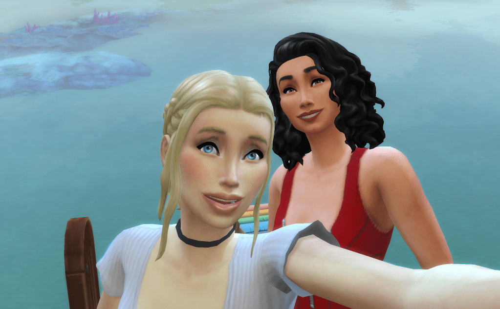 I first started playing Sim Ella’s life in the fall of 2014. Now in 2020, Sim Ella’s granddaughter Eloise has just moved in with her girlfriend, an artist named Payton. They live in a beach shack on the shore of Sulani, with rainbow pride flags on the front porch and a large art wall where Payton can sell her paintings. Eloise is a lifeguard, which gives her plenty of time off to work on her tan and fish in a nearby cove. They’re enjoying young adulthood free from responsibility, beyond paying their electric bill.
