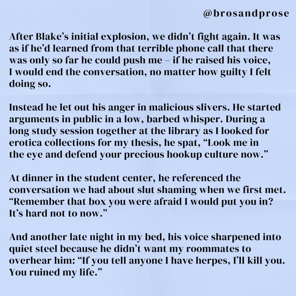 First, though it may surprise some to hear it, I care a great deal for all of my exes, even those whom I no longer speak to. I have no desire to lay someone’s weakest moments out for public consumption. It is already hard to bare my worst self to the internet’s scrutiny—I don’t want to drag anyone onto the examination table beside me.