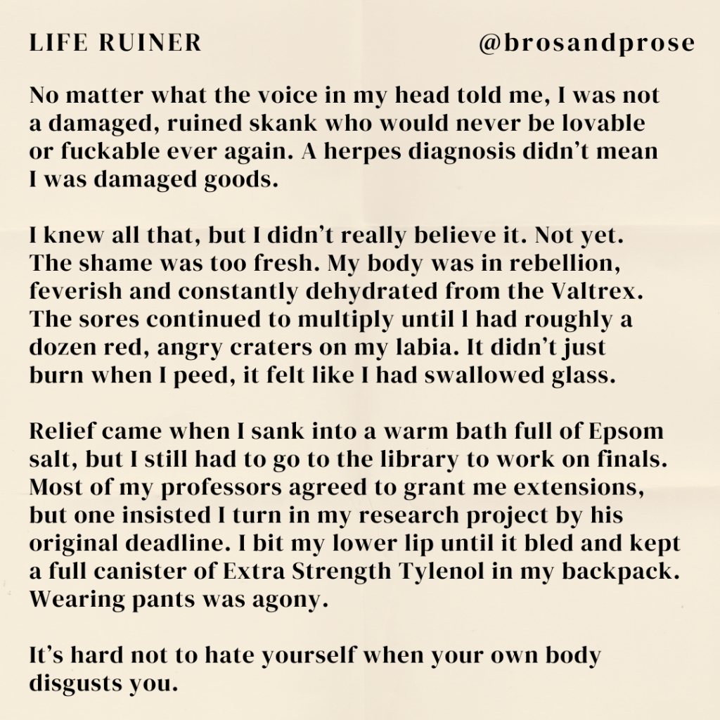 During quarantine I’ve edited those forty pages into something with purpose: a reflection on how our mental health can deteriorate upon an STI diagnosis, and how STI stereotypes often lead to abusive relationship dynamics. The result is LIFE RUINER, a micro-memoir about my earliest days with herpes and the boy I thought I loved at the time. There is a disconnect between conversations about intimate partner violence (IPV) and about sexually transmitted infections; this story sits neatly in that chasm. My hope is that it will help others who have dealt with nondisclosure, unkind partners and self-loathing.